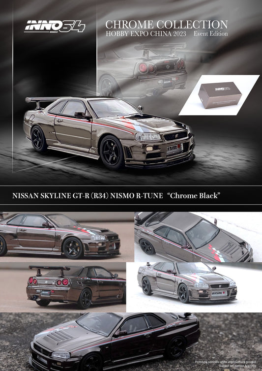 Inno64 Chrome Collection Hobby Expo China 2023 Nissan Skyline GTR R34 Nismo R Tune Chrome Black 1:64