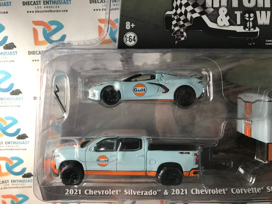CHASE Greenlight Hitch & Tow Racing 2021 Silverado Corvette C8 Enclosed Hauler Gulf 1:64