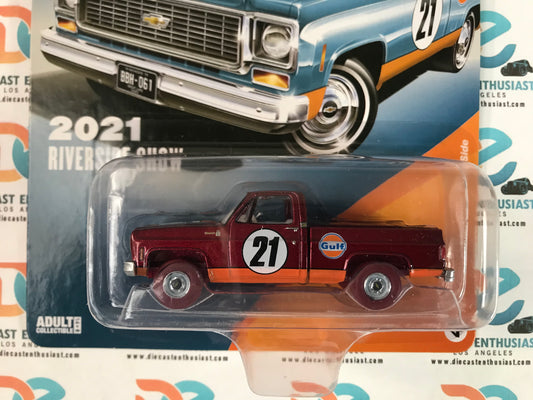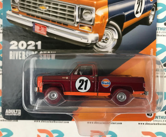 CHASE Auto World Diecastz Exclusives 2021 Riverside Show 1976 Chevy Cheyenne Fleetside Gulf Deep Blue 1:64