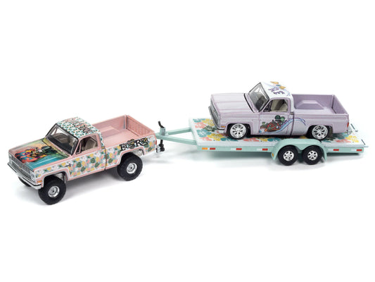 Auto World 2023 Las Vegas Convention Exclusives 1983 Chevrolet Silverado 10 Fleetside Lifted & Lowered with Trailer Rat Fink Purple White 1:64