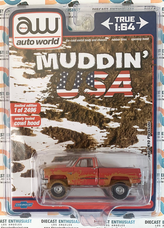 Auto World Exclusives Muddin' USA 1983 Chevy Silverado K10 Fleetside Red Orange 1:64