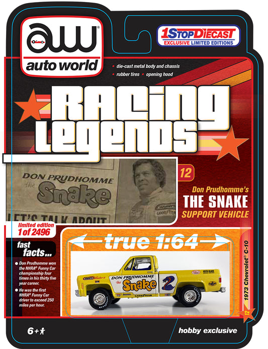 Auto World Exclusives Racing Legends Don Prudhomme The Snake 1973 Chevrolet Cheyenne C10 Yellow 1:64
