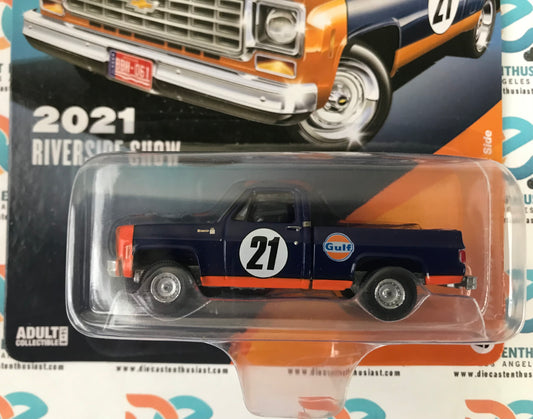 Auto World Diecastz Exclusives 2021 Riverside Show 1976 Chevy Cheyenne Fleetside Gulf Deep Blue 1:64