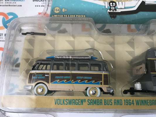 CHASE Greenlight Mijo Exclusives Hitch & Tow Volkswagen Samba Bus & 1964 Winnebago 216 Travel Trailer 1:64