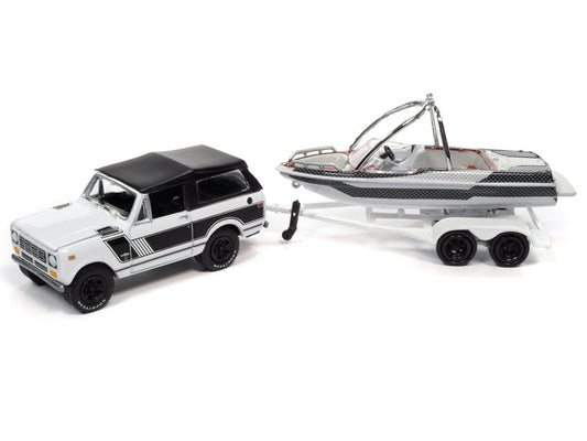 Johnny Lightning Hulls & Haulers 1979 International Scout II with Boat & Trailer White 1:64